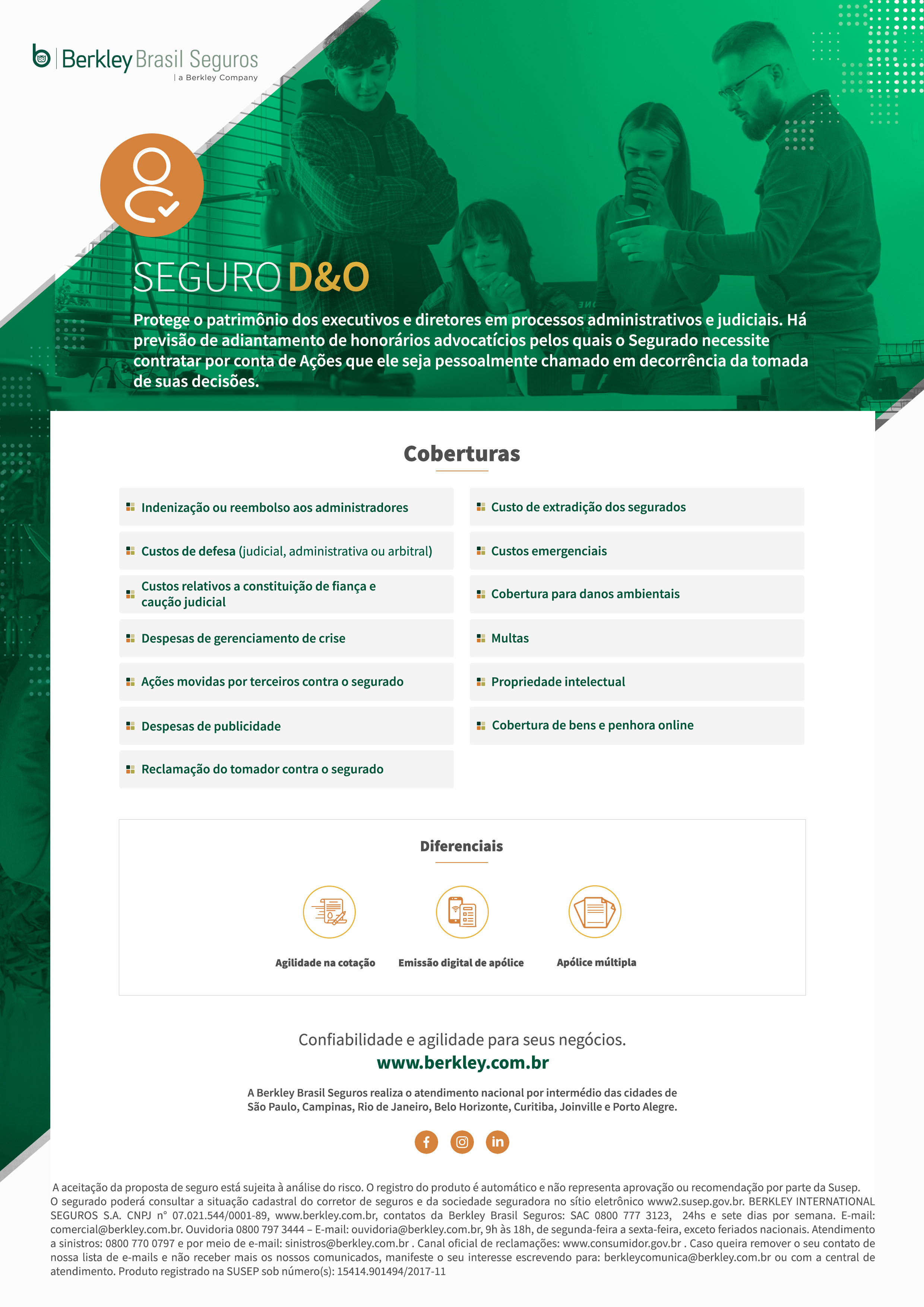 Operando desde 2006 no país, a Berkley Brasil Seguros realiza o atendimento nacional por intermédio das cidades de São Paulo, Campinas, Rio de Janeiro, Belo Horizonte, Curitiba, Joinville e Porto Alegre.