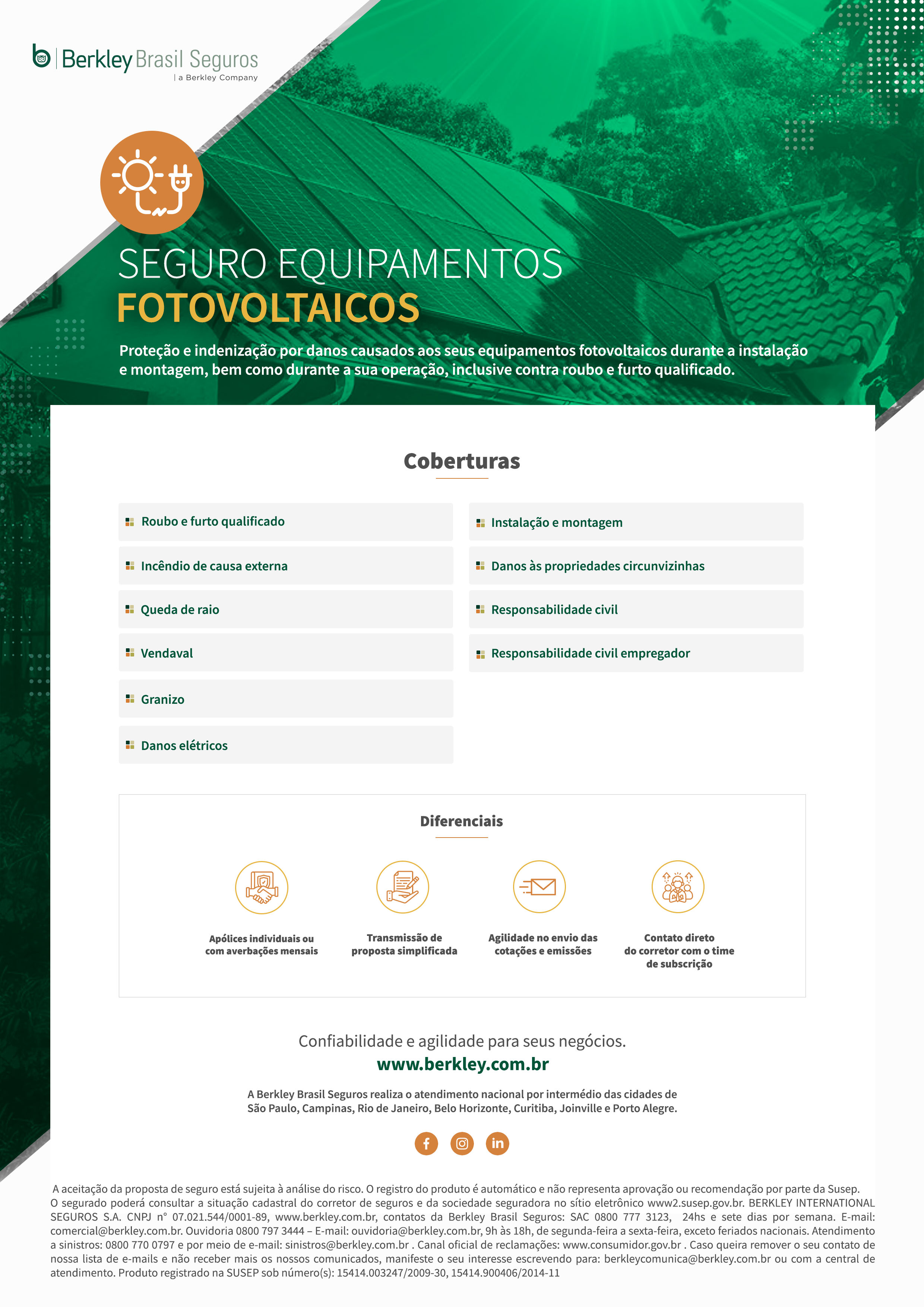 Proteção e indenização por danos causados aos seus equipamentos fotovoltaicos durante a instalação e montagem, bem como durante a sua operação, inclusive contra roubo e furto qualificado.