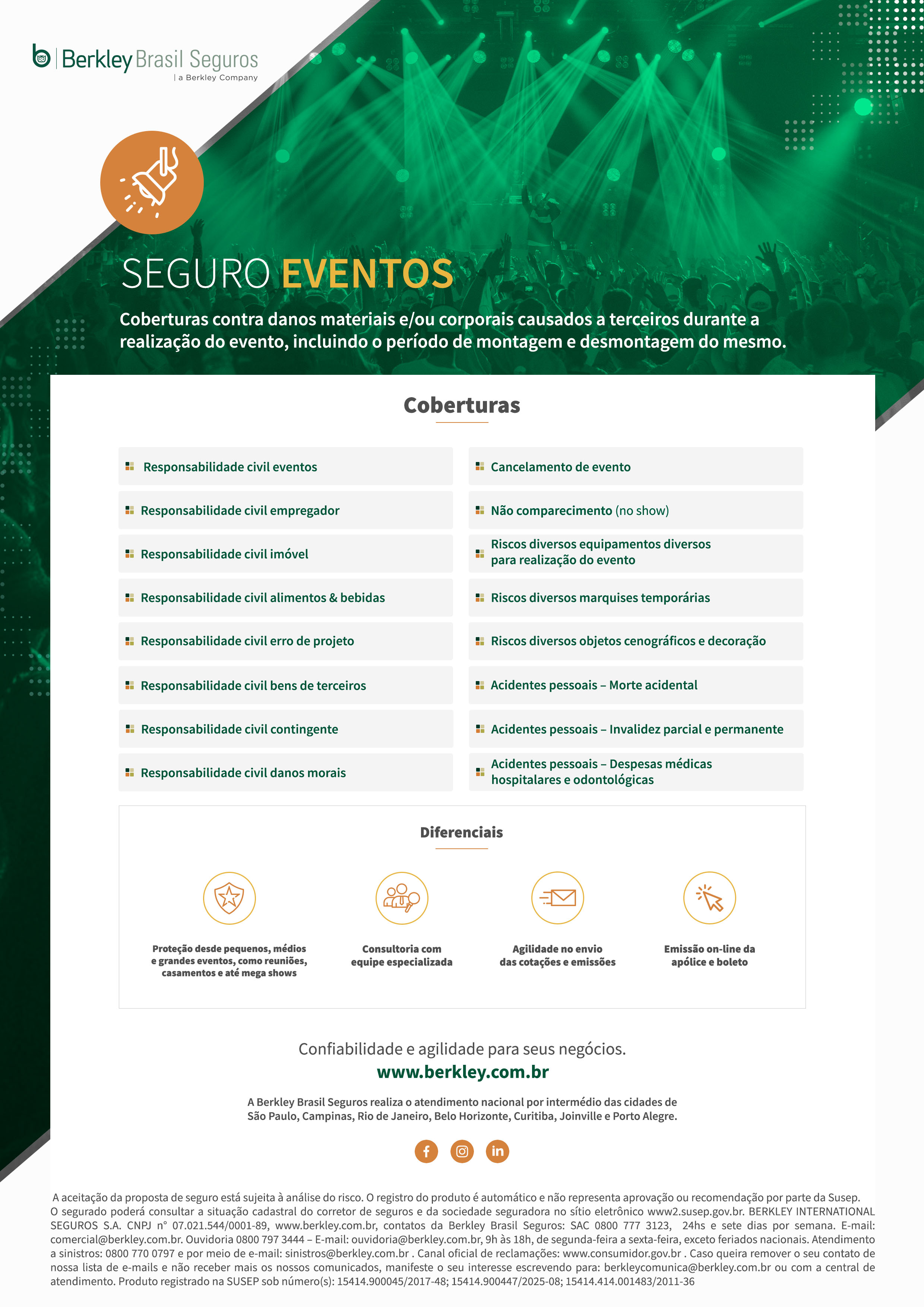 A aceitação da proposta de seguro está sujeita à análise do risco. O registro do produto é automático e não representa aprovação ou recomendação por parte da Susep. O segurado poderá consultar a situação cadastral do corretor de seguros e da sociedade seguradora no sítio eletrônico www.susep.gov.br. BERKLEY INTERNATIONAL SEGUROS S.A. CNPJ n° 07.021.544/0001-89. Contatos da Berkley: SAC 0800 777 3123, E-mail: [email protected]. Ouvidoria 0800 797 3444 – E-mail: [email protected]. Horário de atendimento: 1) SAC - 24hs e sete dias por semana 2) Ouvidoria - das 9h00min às 18h00min, de segunda-feira a sexta-feira, exceto feriados nacionais.