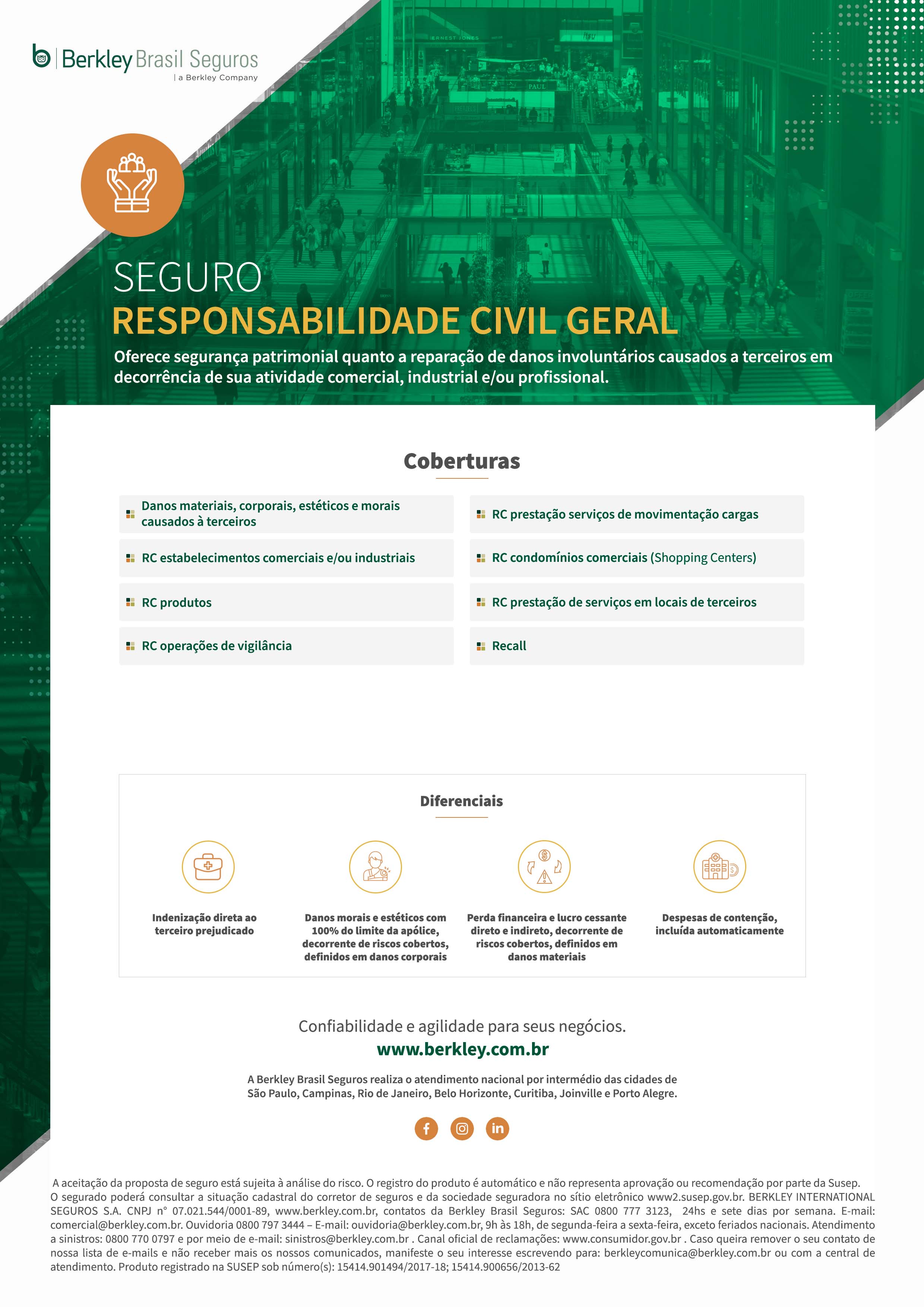 Oferece segurança patrimonial quanto a reparação de danos involuntários causados a terceiros em decorrência de sua atividade comercial, industrial e/ou profissional.