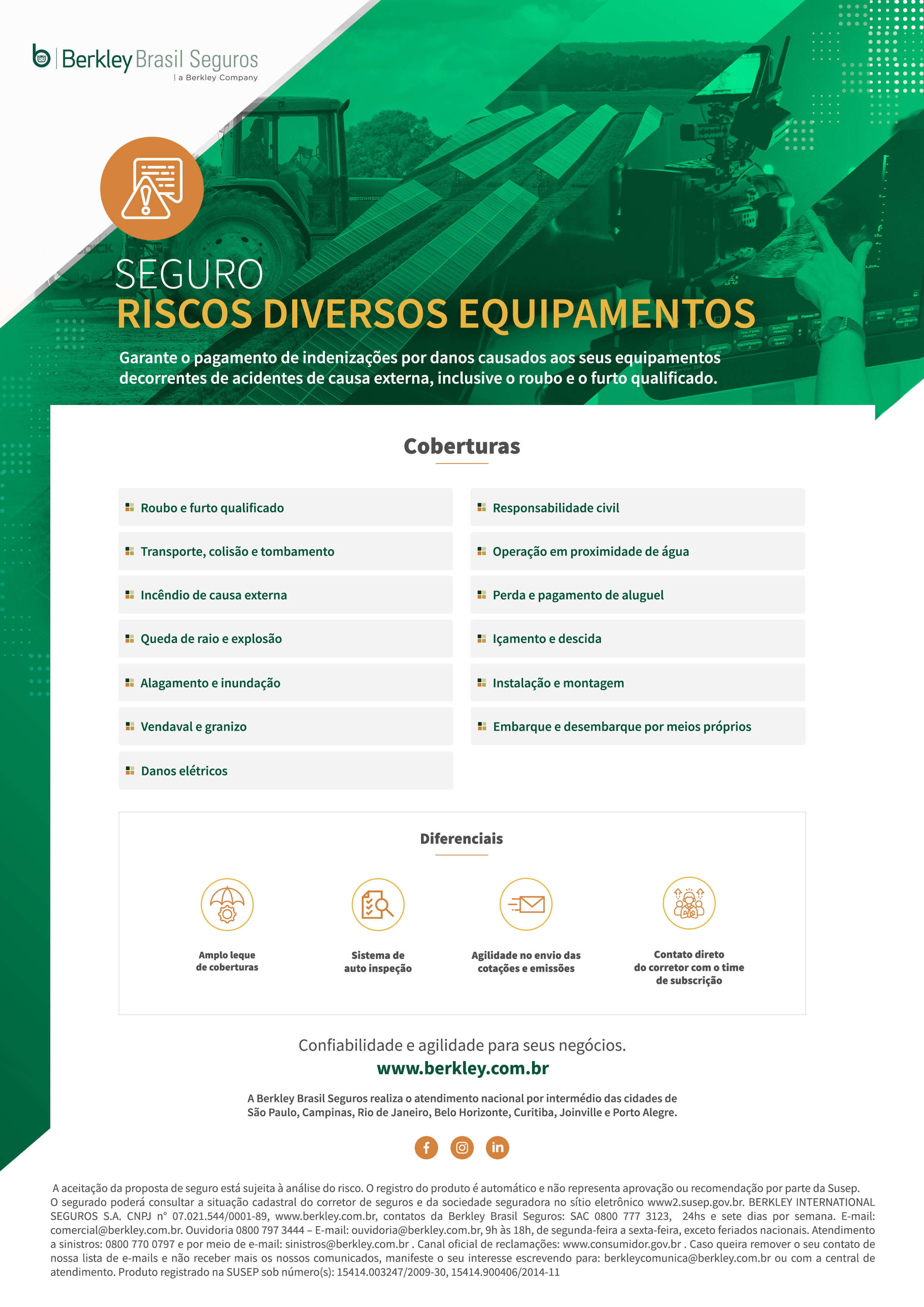 Garante o pagamento de indenizações por danos causados aos seus equipamentos decorrentes de acidentes de causa externa, inclusive o roubo e o furto qualificado.